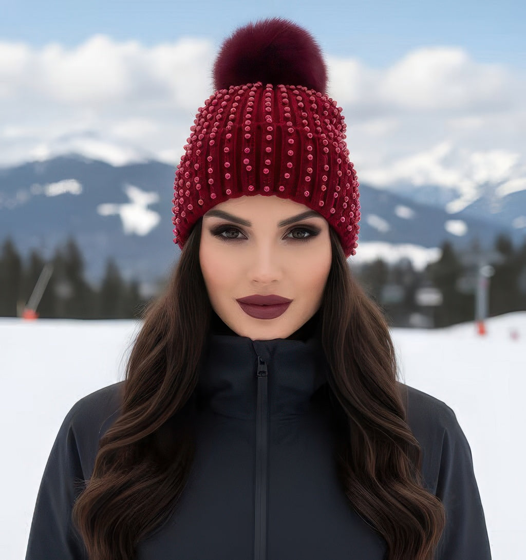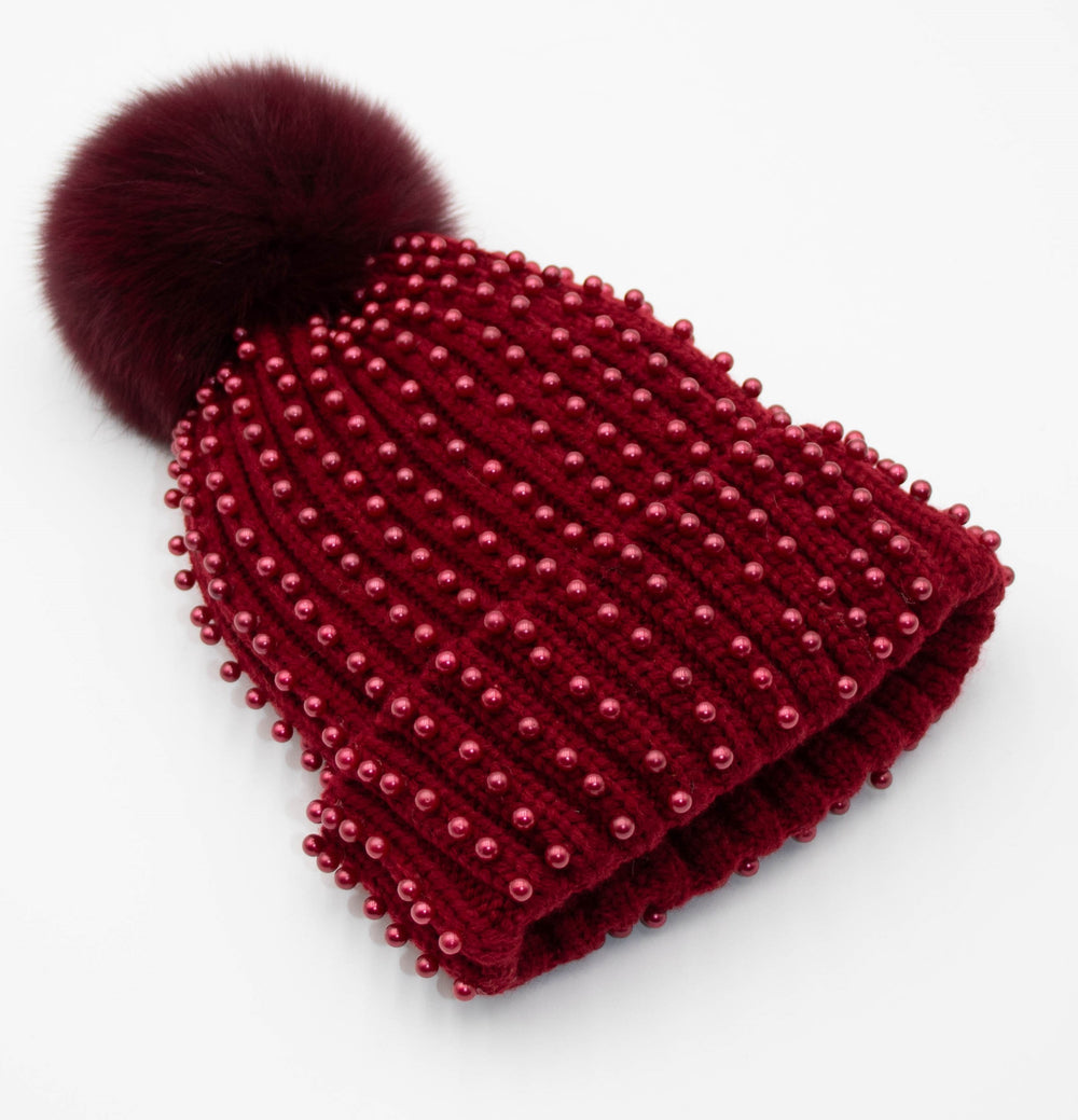 Pearl Knit Beanie With Fox Pom