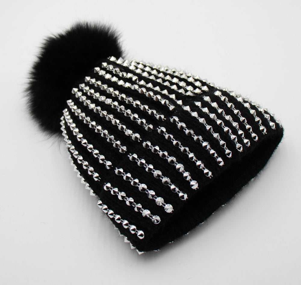 Studded Knit Beanie With Fox Pom