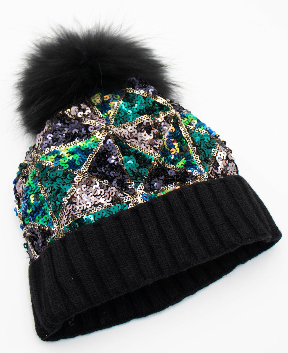 Sequin Knit Pom Beanie With Fox Pom