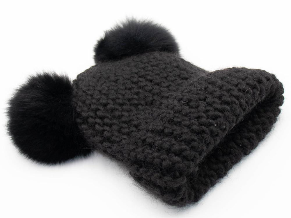 Chunky Knit Beanie With Double Fox Pom