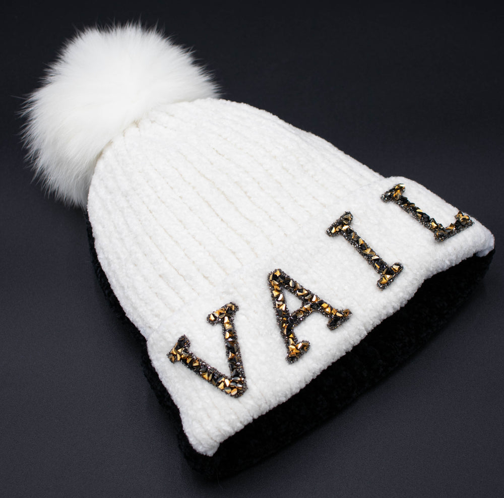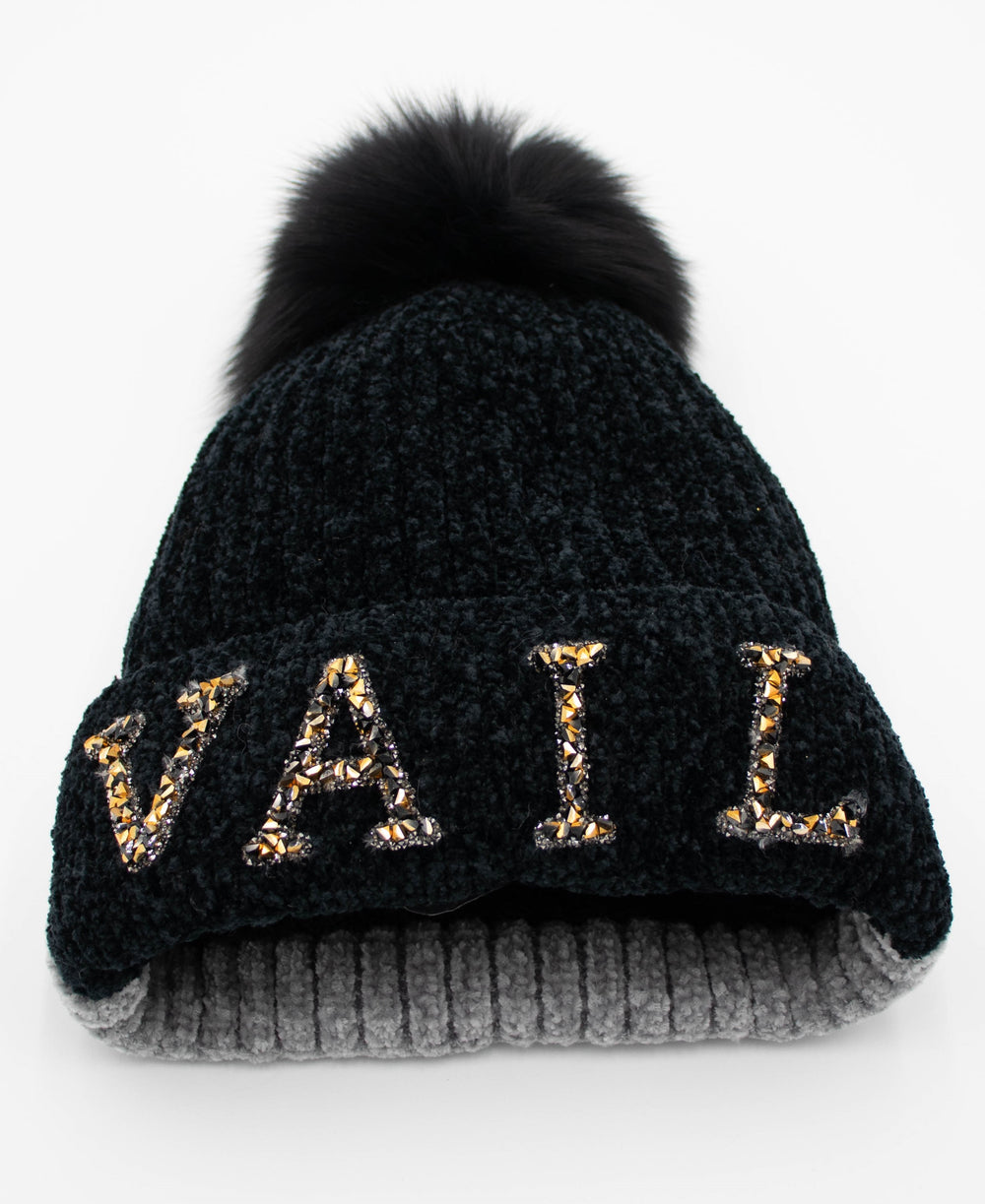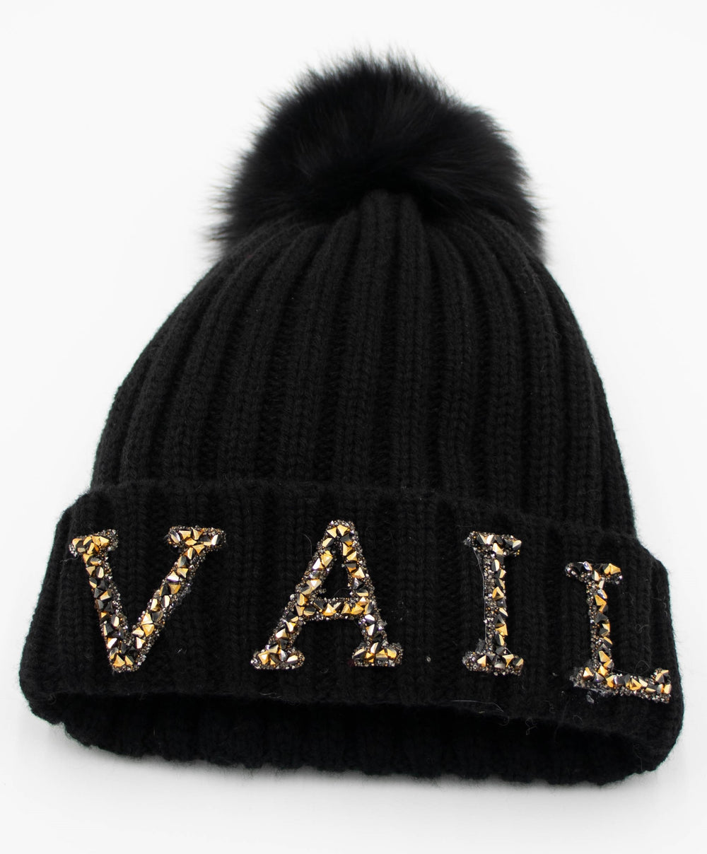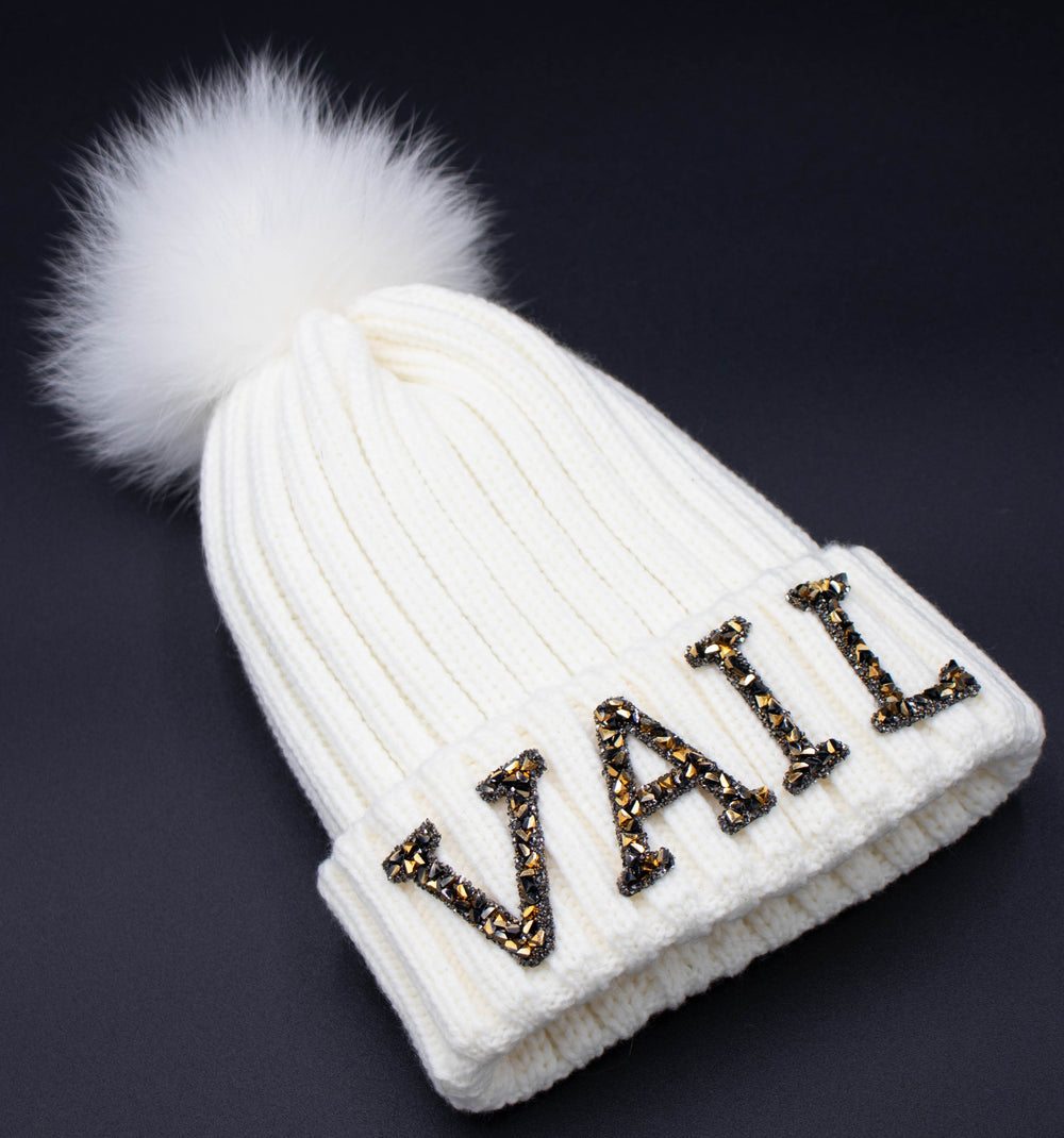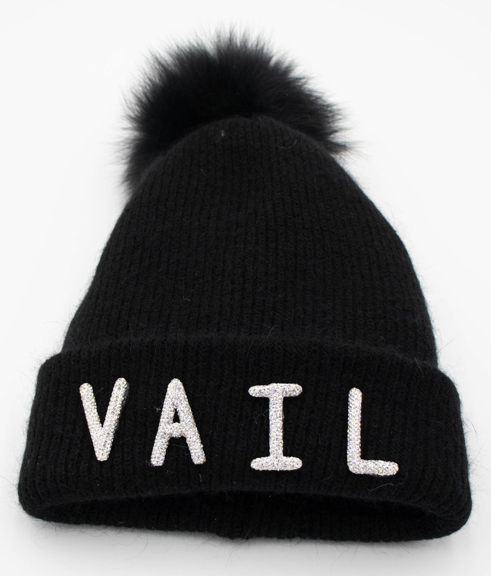 Crystal Vail Knit Beanie With Fox Pom