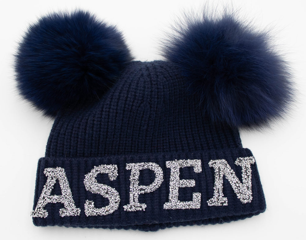 Crystal Aspen Knit Beanie With Double Fox Pom