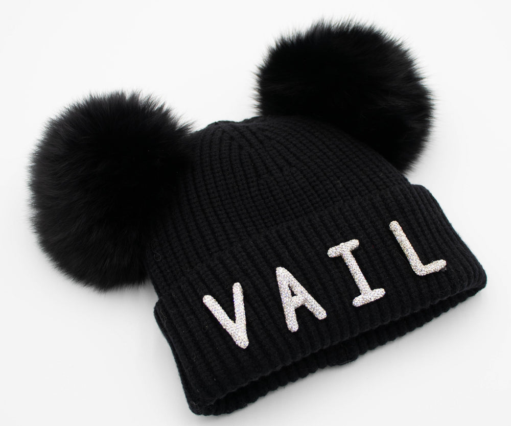 Crystal Vail Knit Beanie With Double Fox Pom
