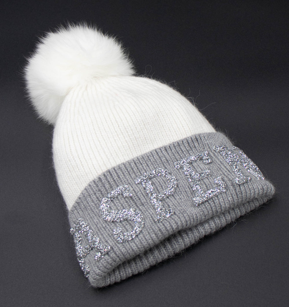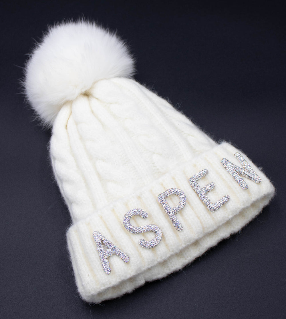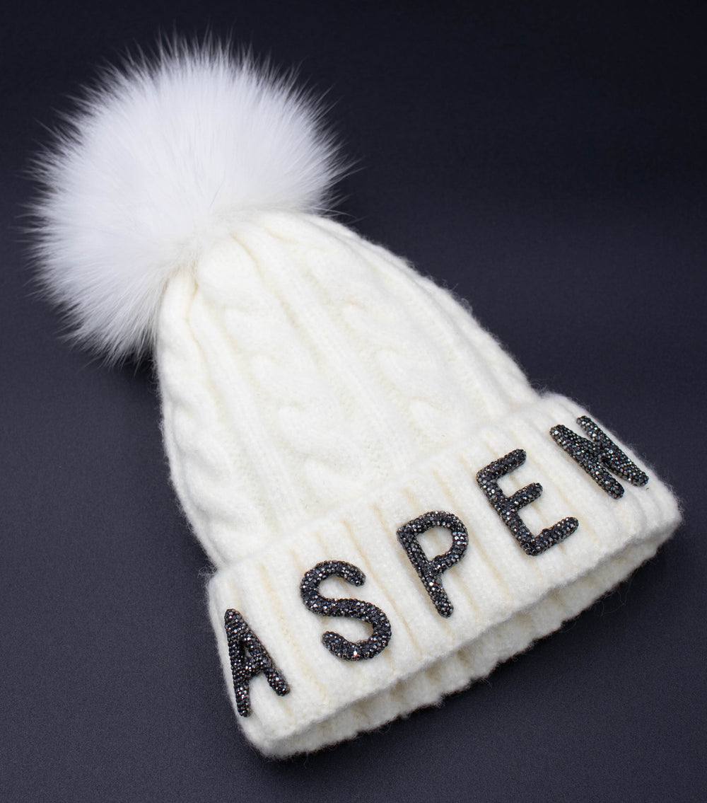 Crystal Aspen Knit Beanie With Fox Pom