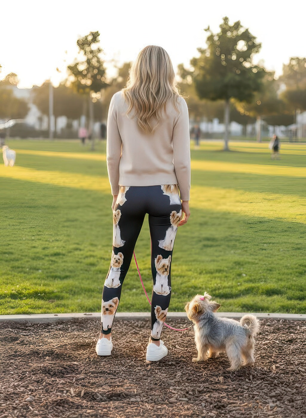 Who needs jeans or sweatpants when you can look this cute? A Yorkshire Terrier dog breed print amps up the adorable quotient on these technical gear leggings.
