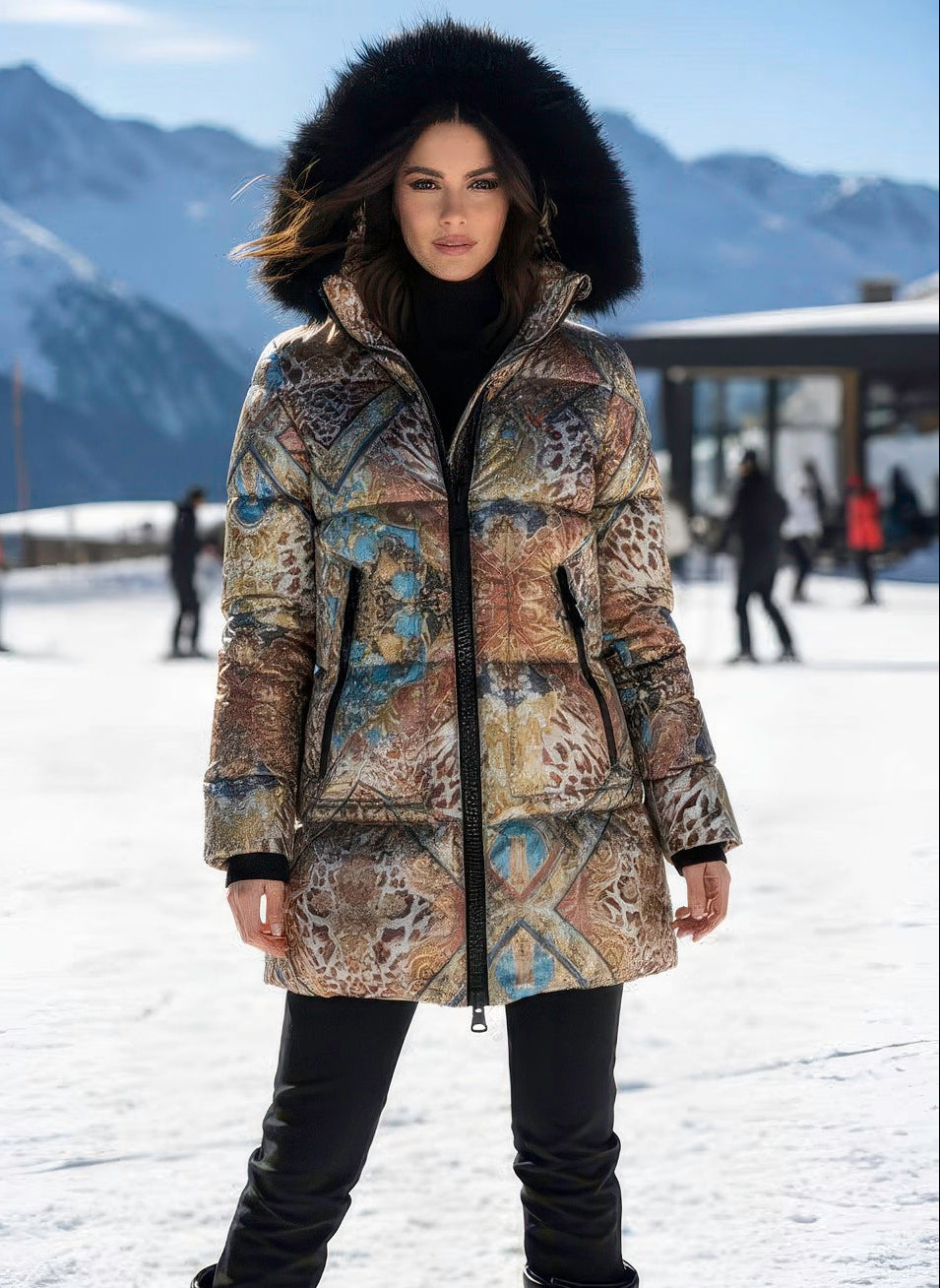 Perfect for city streets, alpine retreats, or après occasions, the coat transitions seamlessly across settings. Its combination of satin, goose down, and fox-trim hood ensures both functional warmth and statement-making elegance.